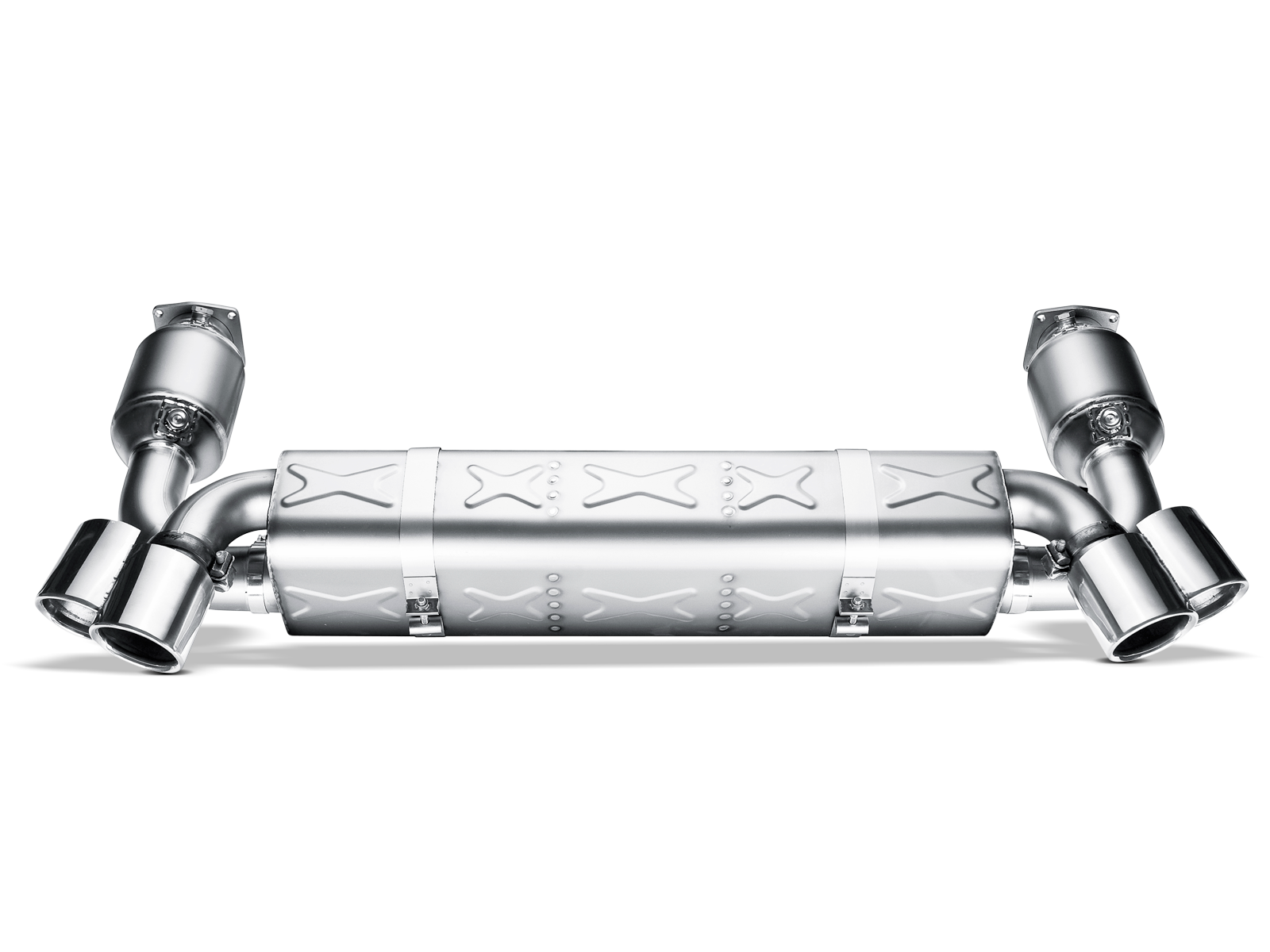 The Slip-On system for the Turbo is made of our proprietary titanium and comprises a center muffler and a set of unique tailpipes. Two turbo chargers and two air intercoolers considerably increase the weight of the 997 Turbo engine in comparison to the atmospheric model. The lighter performance exhaust system unburdens the rear end and centralizes the weight in a more balanced manner. The Slip-On exhaust system dramatically changes the power-to-weight ratio with weight savings and big gains in power and torque. The turbines of the Turbo strongly absorb the sound of the engine, but we were able to compensate for this. We were able to give the otherwise quiet Turbo a sonorous sound impression.
